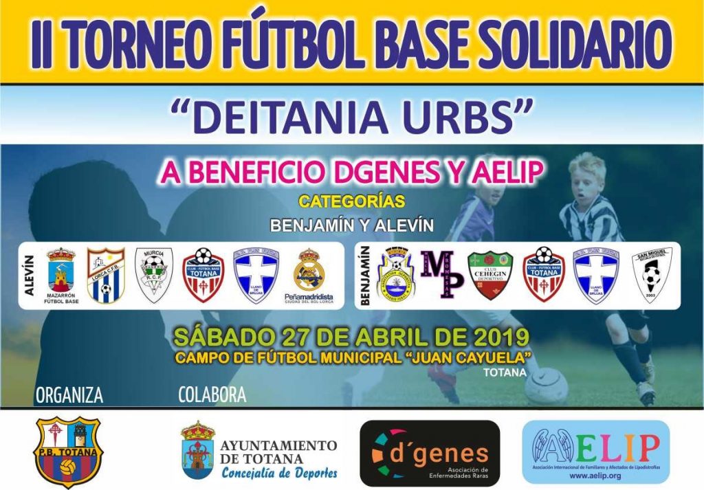 El campo municipal “Juan Cayuela” de Totana acogerá el próximo sábado, 27 de abril, el II Torneo Fútbol Base Solidario “Deitania Urbs”, a beneficio de la Asociación de Enfermedades Raras D´Genes y la Asociación Internacional de Familiares y Afectados de Lipodistrofias (AELIP).