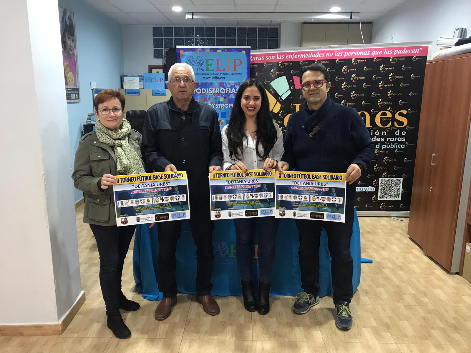 El presidente de la Peña Barcelonista de Totana y D´Genes, Juan Carrión Tudela; la vicepresidenta de AELIP, Presentación Martínez; la concejala de Deportes del consistorio totanero, Isabel María Molino; y Andrés Martínez Tudela, alma y promotor de este II Torneo Fútbol Base Solidario, han presentado este evento deportivo, que permitirá unir deporte y solidaridad ya que los beneficios se destinarán a ambas asociaciones, para el mantenimiento de la cartera de servicios que ofrecen para mejorar la calidad de vida de personas que conviven con patologías poco frecuentes, en el caso de D´Genes, y lipodistrofias, en el de AELIP.