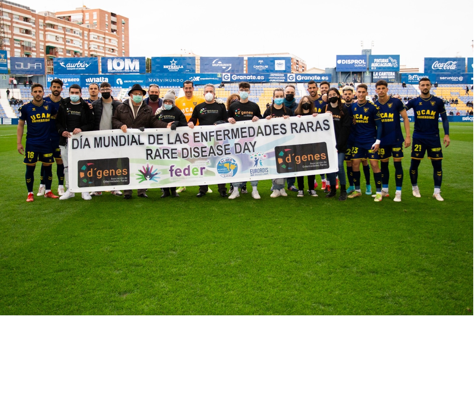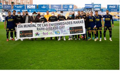 El Universidad Católica de Murcia Club de Fútbol ha querido sumarse a apoyar el Día Mundial de las Enfermedades Raras. En la previa del encuentro que le ha enfrentado al San Fernando en el BeSoccer Condomina los jugadores del UCAM Murcia CF han posado junto a miembros de la Asociación de Enfermedades Raras D´Genes con una pancarta del Día Mundial de las Enfermedades Raras.