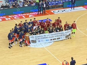 Antes del inicio del encuentro, miembros y voluntarios de D’Genes han salido a la cancha y se han fotografiado con jugadores de ambos equipos exhibiendo una pancarta del Día Mundial de las Enfermedades Raras, que se celebró el pasado 28 de febrero.