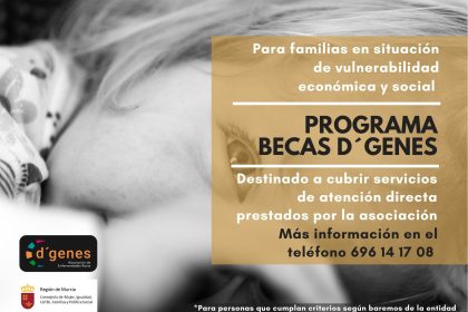 La Asociación de Enfermedades Raras D´Genes quiere ayudar a las personas que necesiten servicios de atención directa pero se encuentren en una difícil situación económica. Por ello, pone a disposición de personas en situación de vulnerabilidad social su Programa de Becas de D´Genes, orientado a facilitar el uso de los servicios terapéuticos que ofrece a aquellas familias y afectados por enfermedades poco frecuentes que acrediten tener dificultades económicas para asumir las cuotas de usuarios.