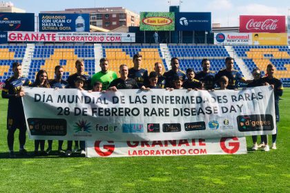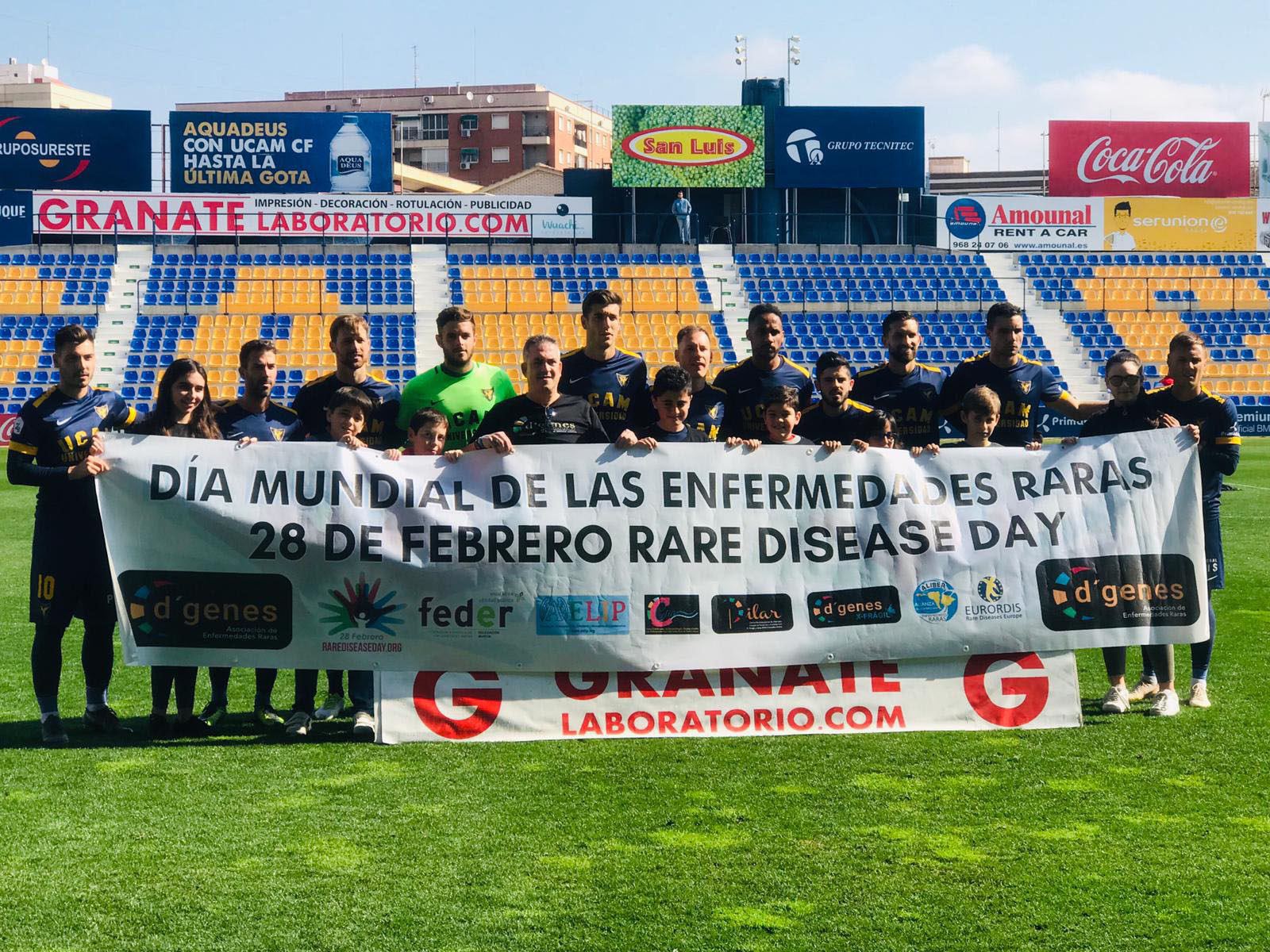 Minutos antes del inicio del encuentro que ha disputado el conjunto universitario en el estadio de La Condomina contra el Almería B, jugadores del UCAM CF han posado en el terreno de juego con una pancarta del Día Mundial de las Enfermedades Raras, junto a miembros y voluntarios de la Asociación de Enfermedades Raras D´Genes.