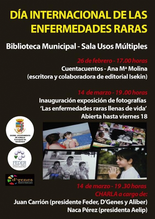 Para ello, se han organizado por parte de la Asociación de Enfermedades Raras D´Genes, la Federación Española de Enfermedades Raras (FEDER) y la Concejalía de Salubridad del Consistorio de Jumilla, diversas actividades para conmemorar esta efeméride y dar difusión y visibilidad a la realidad de las patologías poco frecuentes. La primera de ellas tendrá lugar mañana viernes, 26 de febrero, a las 17:00 horas, en la Sala de usos múltiples de la Biblioteca municipal, y consistirá en un cuentacuentos a cargo de la escritora y colaboradora de la editorial Isekin Ana Mª Molina. La escritora jumillana ofrecerá cuatro cuentacuentos, entre ellos “La historia de Federito. El Trébol de 4 hojas” y su última obra literaria titulada "Super Carla" que está dedicada a una niña de Yecla.