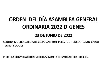 La Asociación de Enfermedades Raras D´Genes celebrará el próximo 23 de junio de 2022 su Asamblea General Ordinaria. Tendrá lugar a las 20.00 horas en primera convocatoria y a las 20:30 en segunda, en el Centro Multidisciplinar “Celia Carrión Pérez de Tudela”, ubicado en el número 7 de la calle San Cristóbal de Totana.