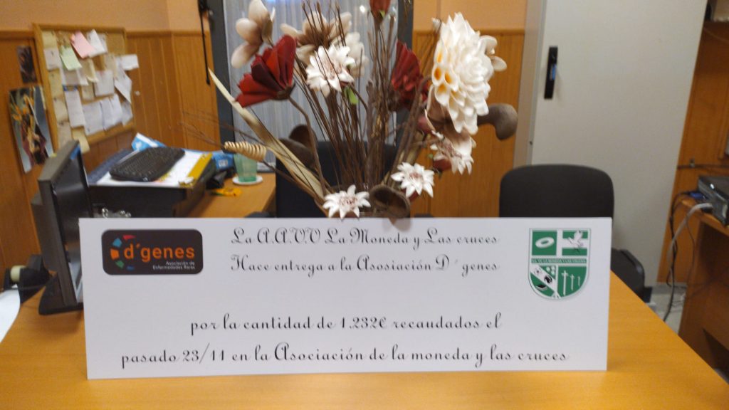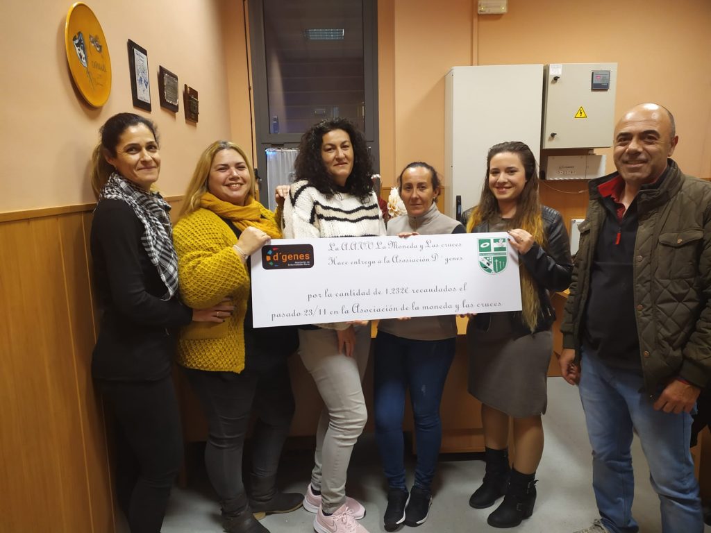 Representantes de la Asociación de Vecinos La Moneda y Las Cruces de Dos Hermanas (Sevilla) han hecho entrega a la Asociación de Enfermedades Raras  D´Genes de un cheque por valor de 1.232 euros recaudados el pasado 23 de noviembre en una fiesta solidaria  favor de la asociación de patologías poco frecuentes.