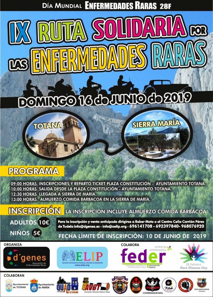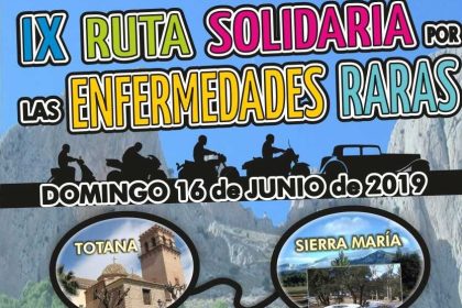 La Asociación de Enfermedades Raras D´Genes, la Asociación Internacional de Familiares y Afectados de Lipodistrofias (AELIP) y la Peña Barcelonista de Totana han organizado la IX Ruta Solidaria por las Enfermedades Raras, que tendrá lugar el próximo 16 de junio entre el municipio murciano de Totana y el almeriense de María.