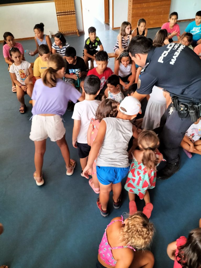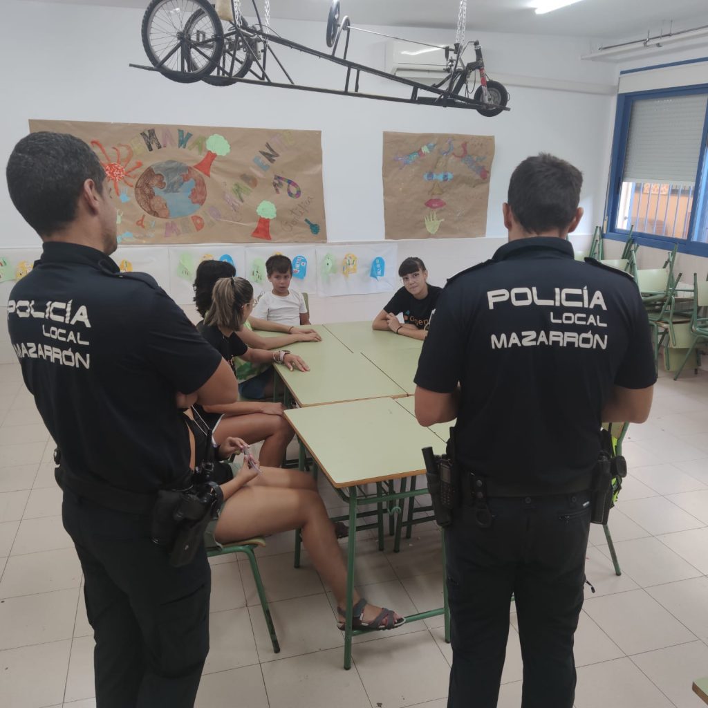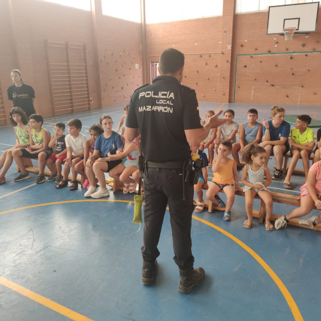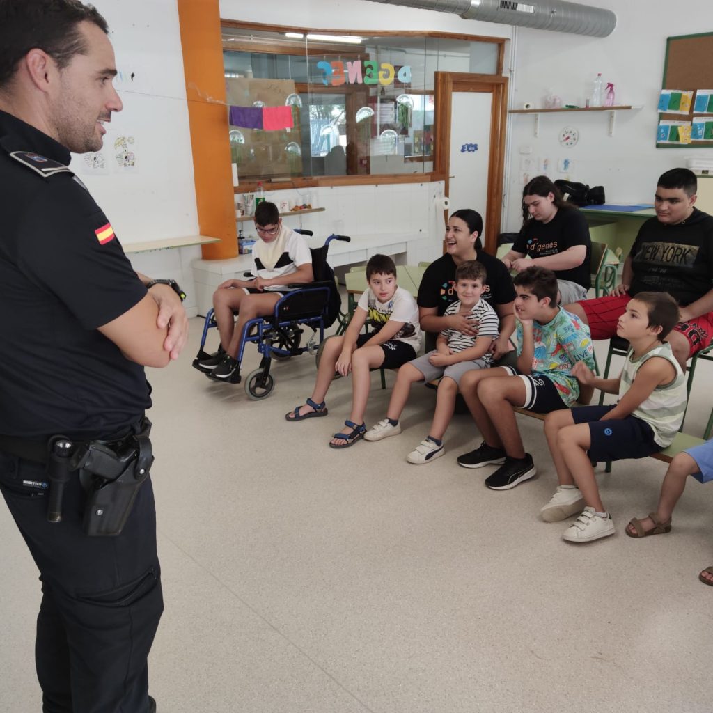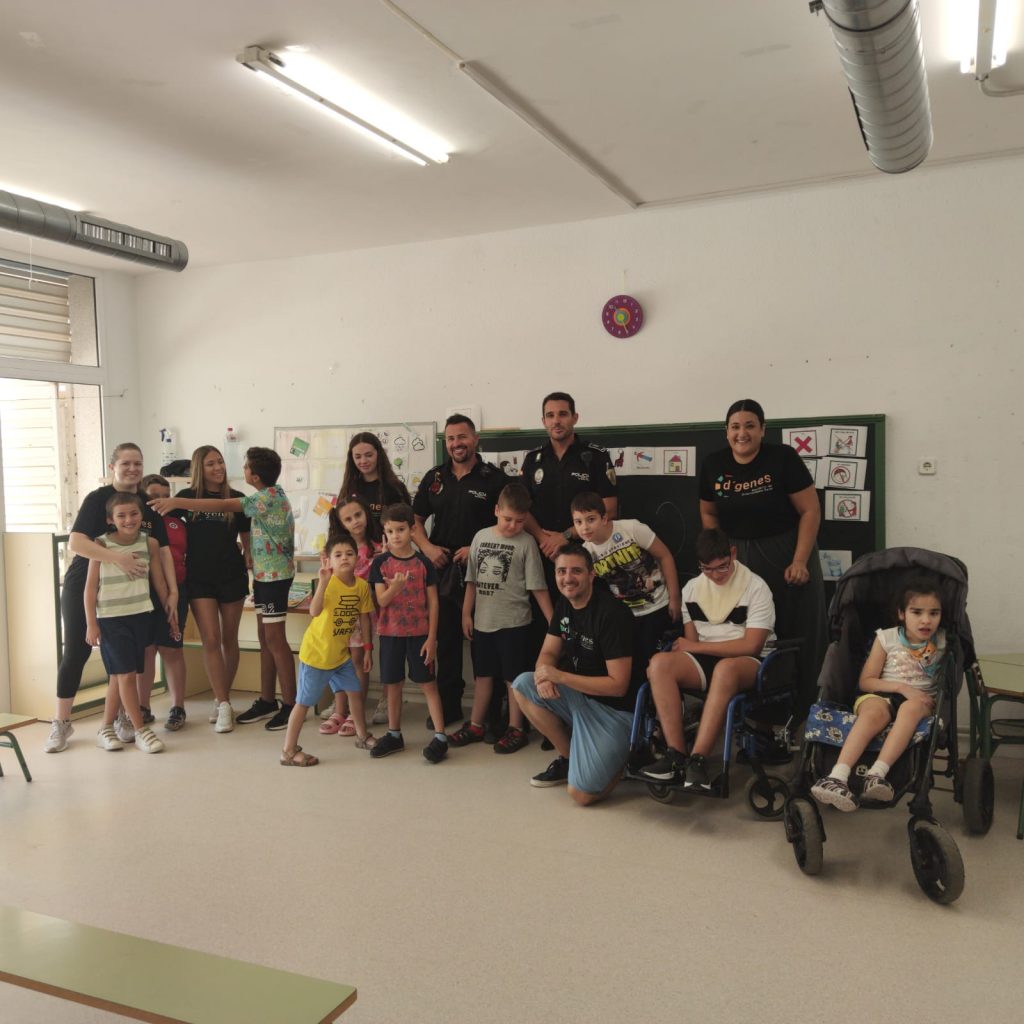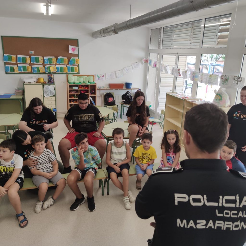 Los asistentes a los Talleres de verano inclusivos que lleva a cabo la Asociación de Enfermedades Raras D´Genes en el municipio de Mazarrón han recibido esta semana la visita de la Policía Local de este municipio. Agentes de este Cuerpo se han desplazado a los dos centros educativos donde se está desarrollando dicho servicio de respiro familiar y han compartido un rato con los niños asistentes.