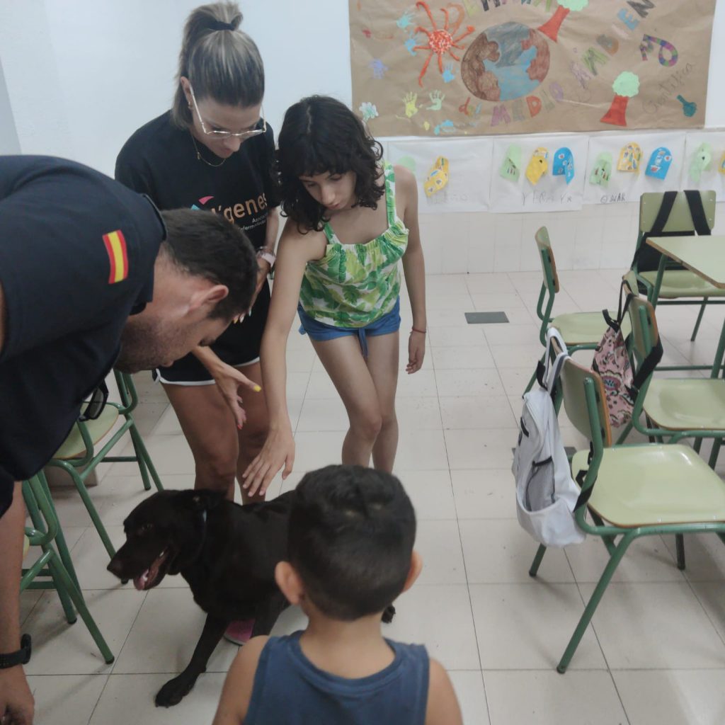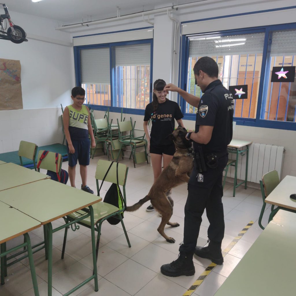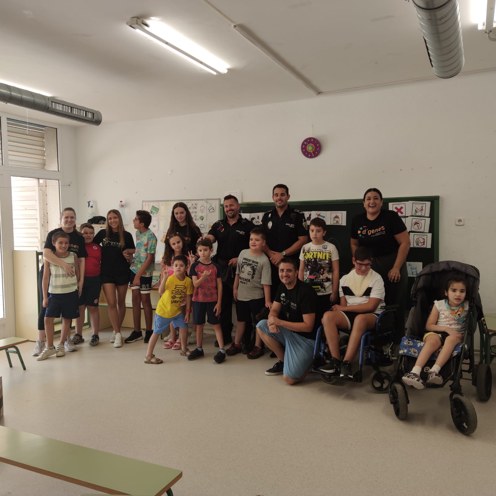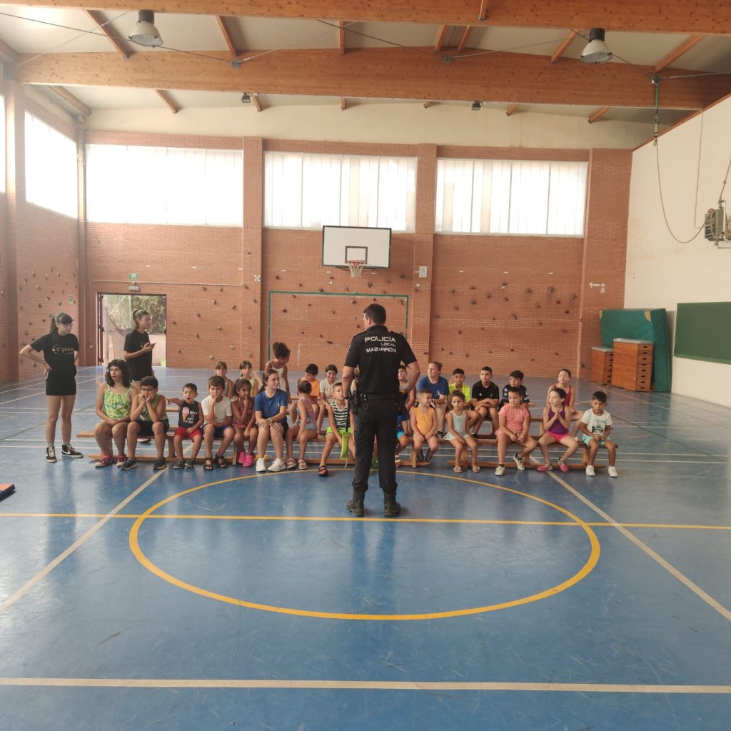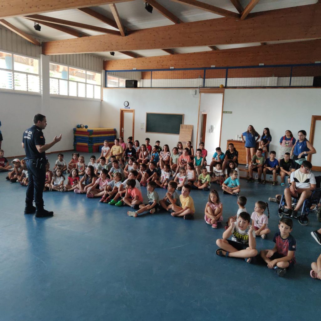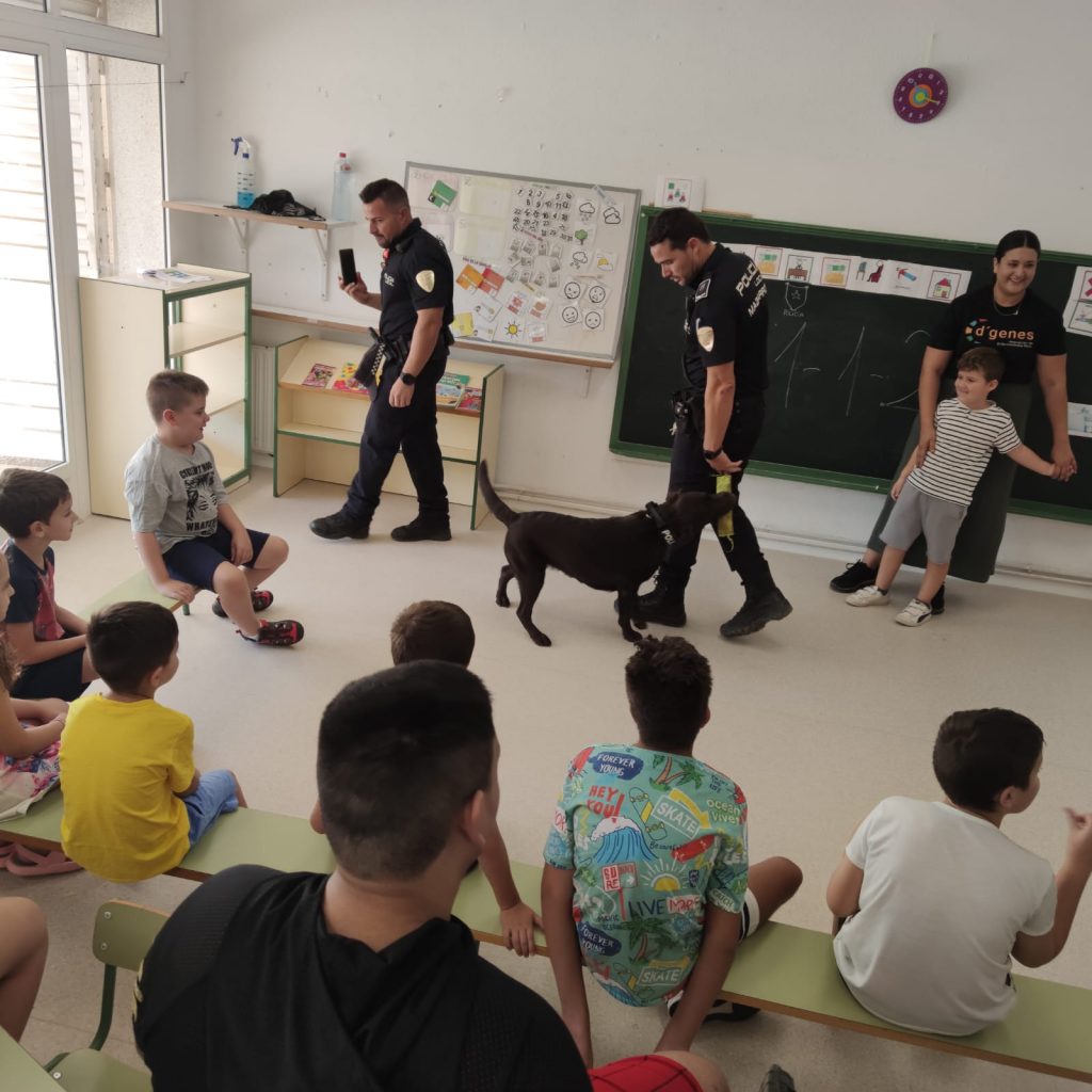Los asistentes a los Talleres de verano inclusivos que lleva a cabo la Asociación de Enfermedades Raras D´Genes en el municipio de Mazarrón han recibido esta semana la visita de la Policía Local de este municipio. Agentes de este Cuerpo se han desplazado a los dos centros educativos donde se está desarrollando dicho servicio de respiro familiar y han compartido un rato con los niños asistentes.