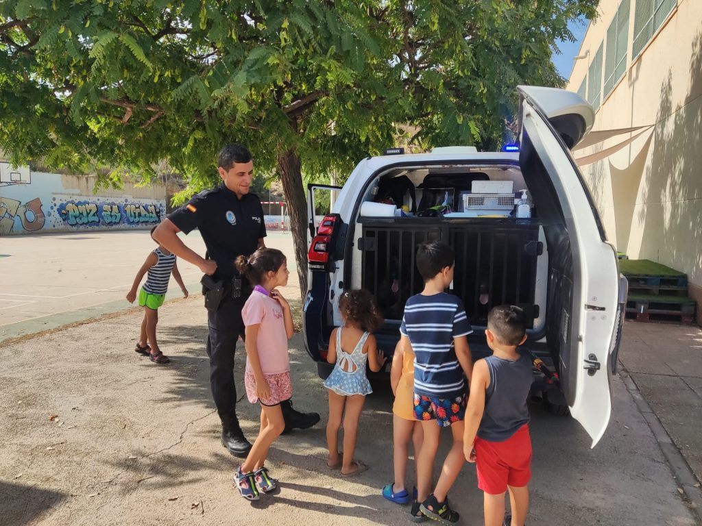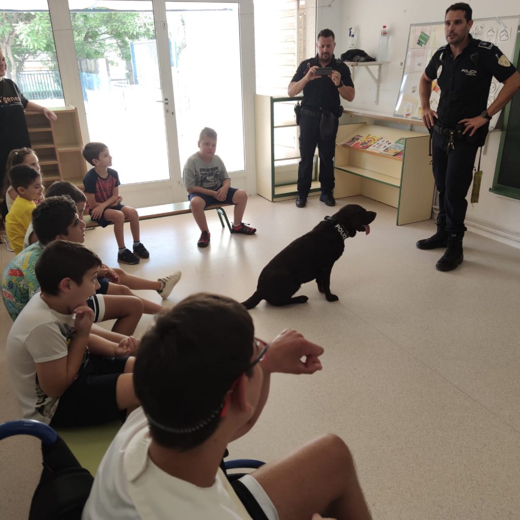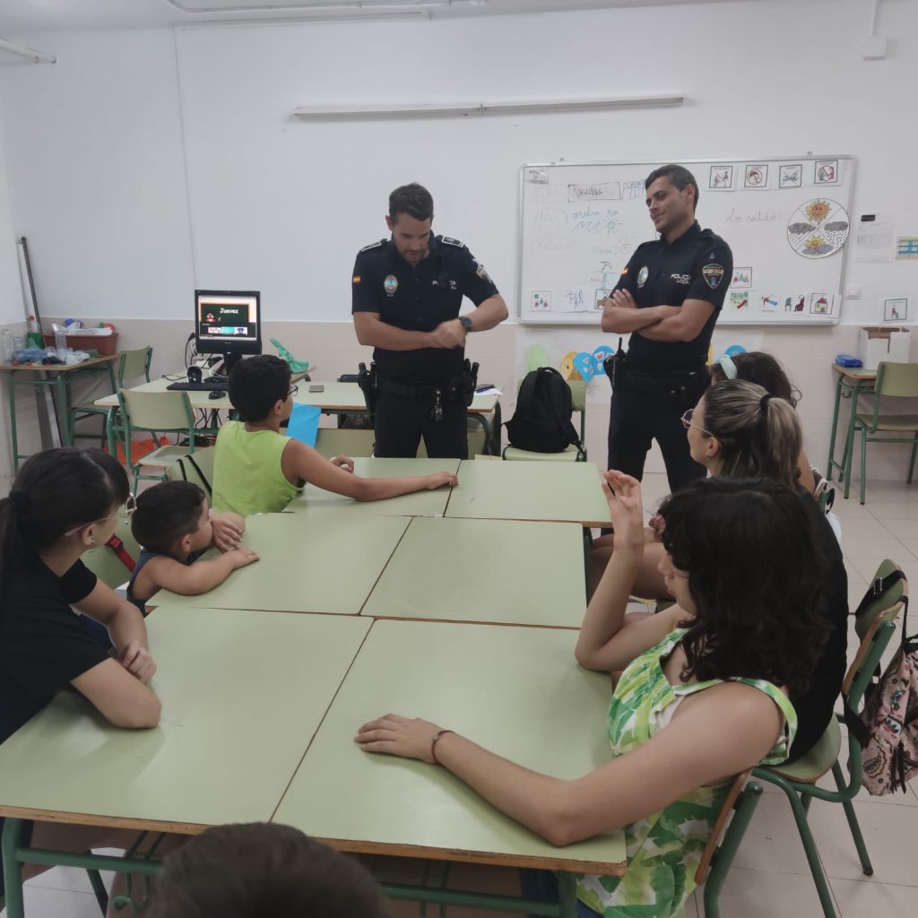 Sobre estas líneas, visita de la Policía al Taller de verano inclusivo que se celebra en el CEIP «La Cañadica»