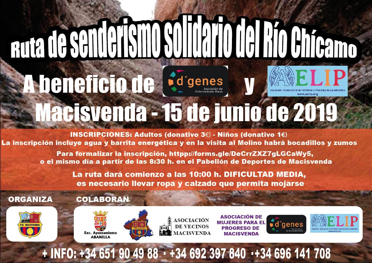 La Ruta de senderismo solidario del Río Chícamo, organizada por la Peña Barcelonista de Macisvenda, a beneficio de la Asociación de Enfermedades Raras D´Genes y la Asociación Internacional de Familiares y Afectados de Lipodistrofias (AELIP), se celebrará el próximo 15 de junio en Macisvenda.