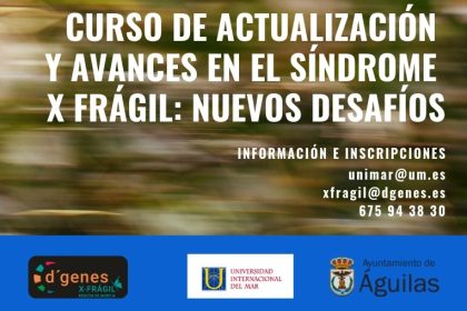 «Curso de actualización y avances en el Síndrome X Frágil: Nuevos desafíos» es el título del programa formativo que se desarrollará los días 9, 10 y 11 de octubre en la sede de Águilas de la Universidad Internacional del Mar, con la implicación de la Asociación de Enfermedades Raras D´Genes. Se estima que en la Región de Murcia más de 350 familias conviven con este síndrome.