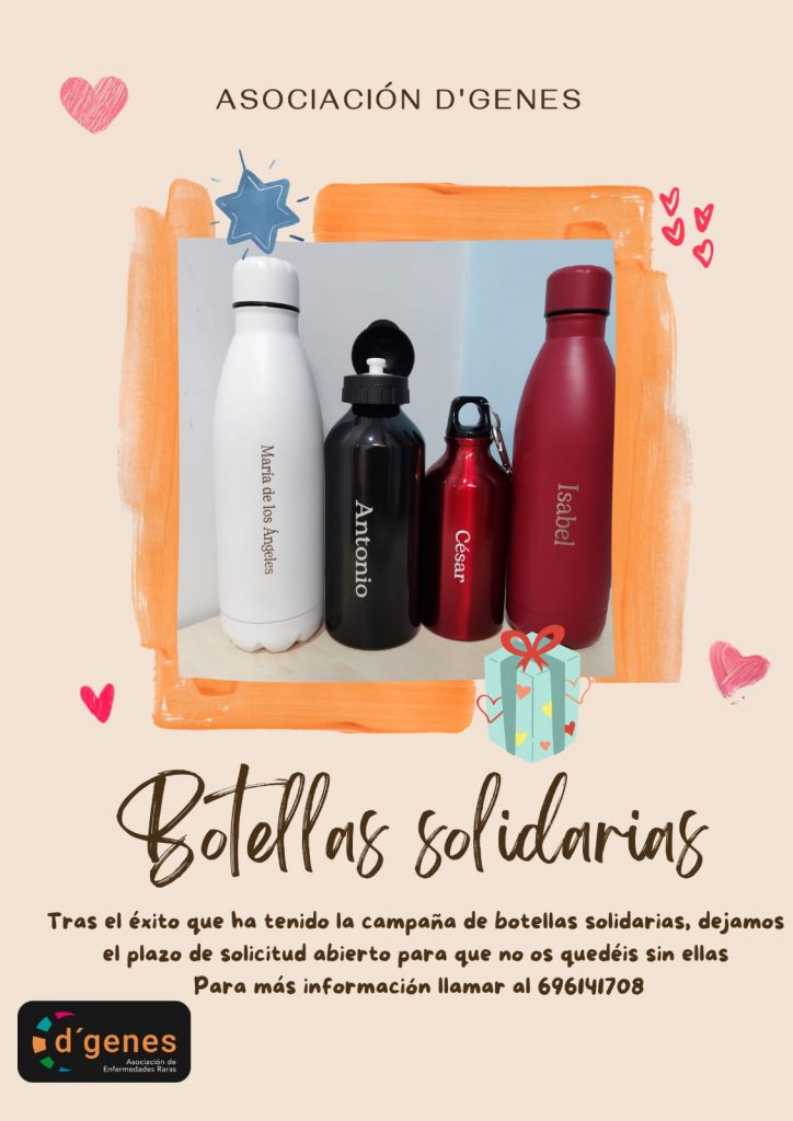 Las botellas solidarias de la Asociación de Enfermedades Raras D´Genes han llegado ya a diferentes provincias españolas. La campaña “Botella solidaria” lanzada por la asociación, con la que se pretende recaudar fondos que contribuyan al mantenimiento de la cartera de servicios que presta la entidad para mejorar la calidad de vida de personas y familias que conviven con patologías poco frecuentes y sin diagnóstico, a la vez que se da visibilidad a las enfermedades raras, ha sido todo un éxito.