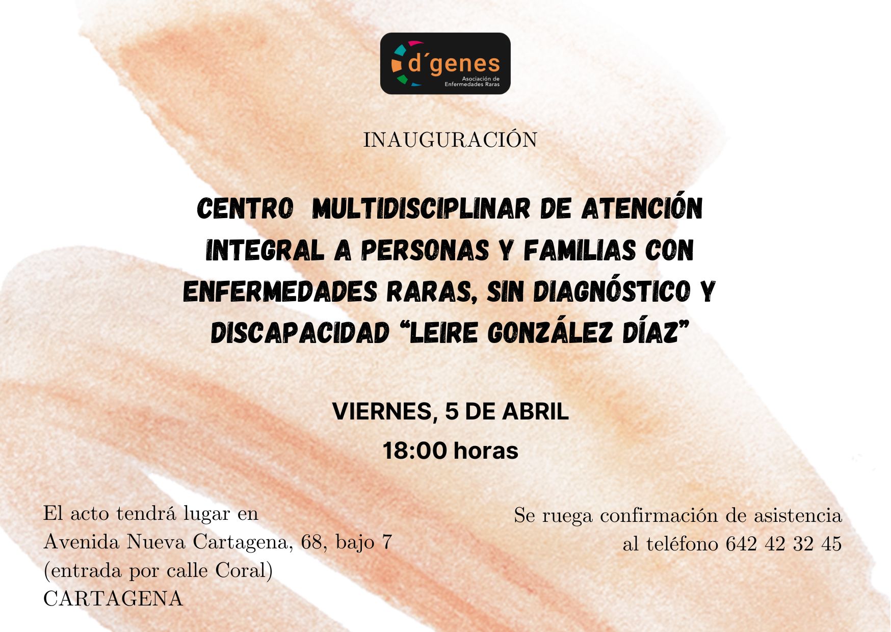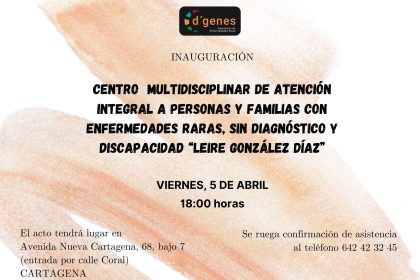 La Asociación de Enfermedades Raras D´Genes inaugurará mañana viernes, 5 de abril, a las 18:00 horas el Centro Multidisciplinar de atención integral a personas y familias con enfermedades raras “Leire González Díaz” en Cartagena.
