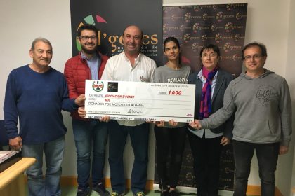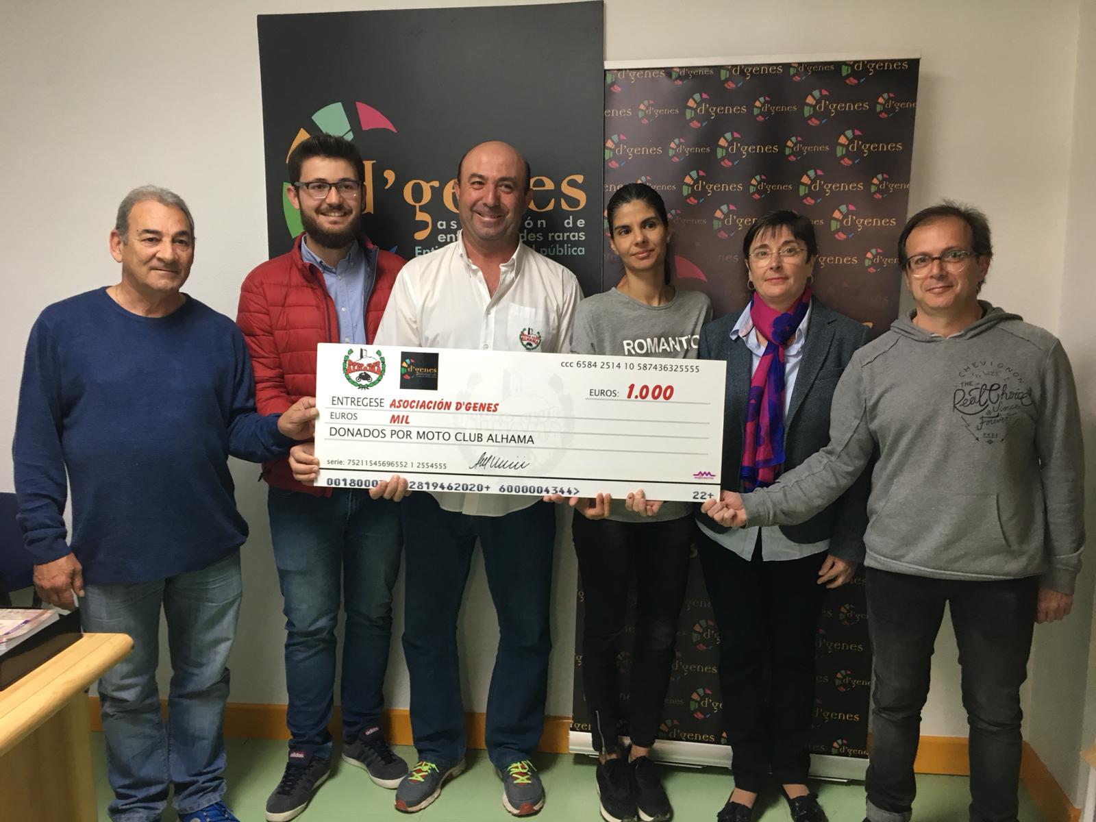 El Motoclub Alhama ha hecho entrega a la Asociación de Enfermedades Raras D´Genes de un cheque por importe de 1.000 euros correspondiente a la recaudación de la prueba del Campeonato regional de Motocross celebrada en Alhama de Murcia el pasado 16 de diciembre.