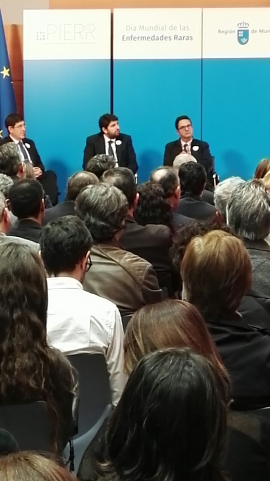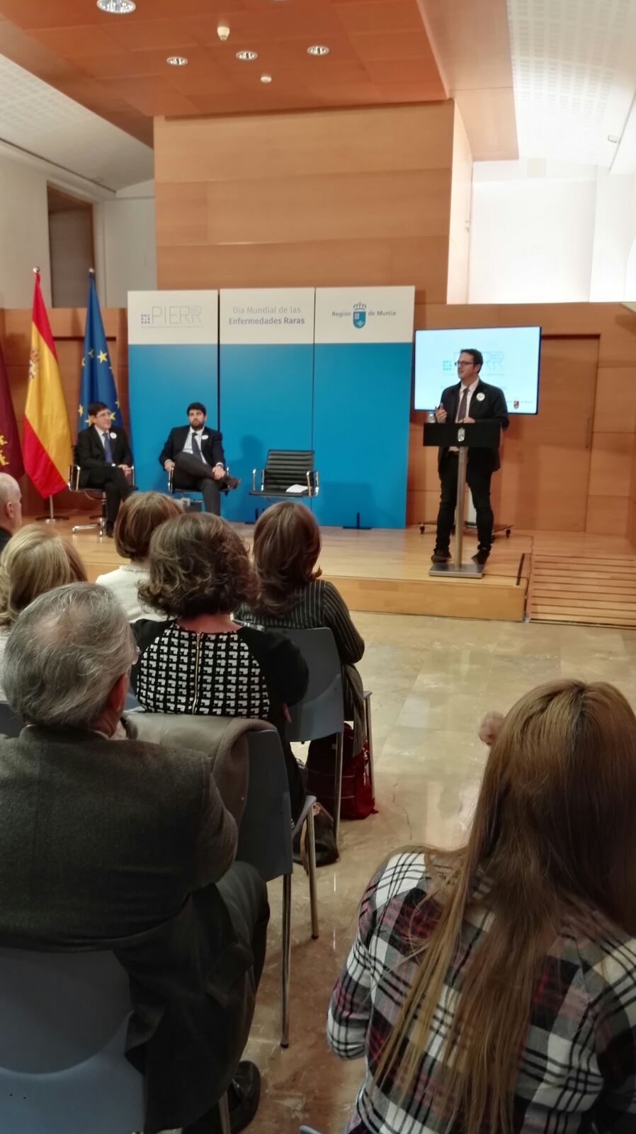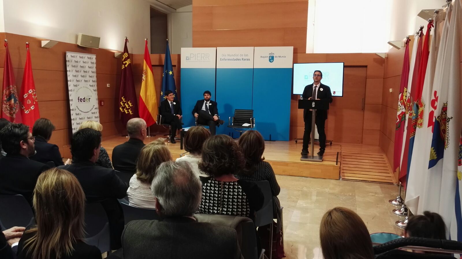 El Palacio de San Esteban de Murcia ha sido el escenario de la presentación del Plan Regional Integral de Enfermedades Raras, que ha tenido lugar precisamente coincidiendo con el acto de celebración del Día Mundial de las Enfermedades Raras, un acto institucional que ha contado con la presencia del presidente de la Región, Fernando López Miras; el consejero de Salud, Manuel Villegas García; y el presidente de la Federación Española de Enfermedades Raras (FEDER) y D´Genes, Juan Carrión.