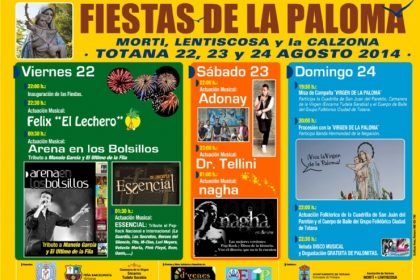 El programa de festejos de La Paloma finalizan el domingo, día 24 de agosto, a las 19:30 horas, con la misa de campaña en la que participarán la Cuadrilla de San Juan de El Paretón y el cuerpo de baile del Grupo Folklórico “Ciudad de Totana”.