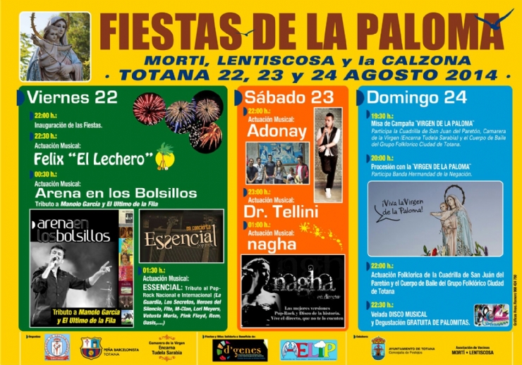 El sábado, día 23 de agosto, tendrá lugar la actuación musical de “Adonay” a las 22:00 horas; del grupo “Dr. Tellini”, a las 23:00 horas; y de “Nagha”, con las mejores versiones de PopRock y Disco de la historia de la música.