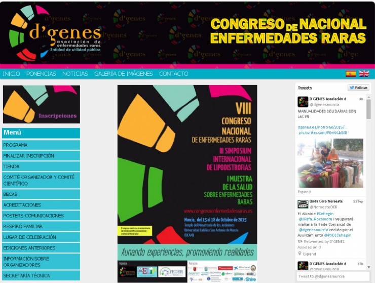 El VIII Congreso Nacional de Enfermedades Raras se celebrará bajo el lema “Aunando experiencias, promoviendo realidades”. Está organizado por la Asociación de Enfermedades Raras D´Genes, con la colaboración de la delegación en Murcia de la Federación Española de Enfermedades Raras (FEDER) y la Asociación de Familiares y Afectados de Lipodistrofias (AELIP), y tendrá lugar en el templo del Monasterio de los Jerónimos, de la Universidad Católica San Antonio de Murcia (UCAM).