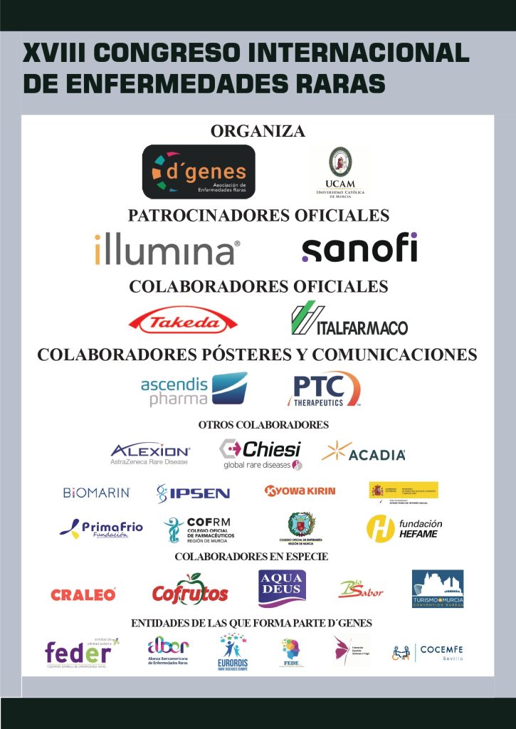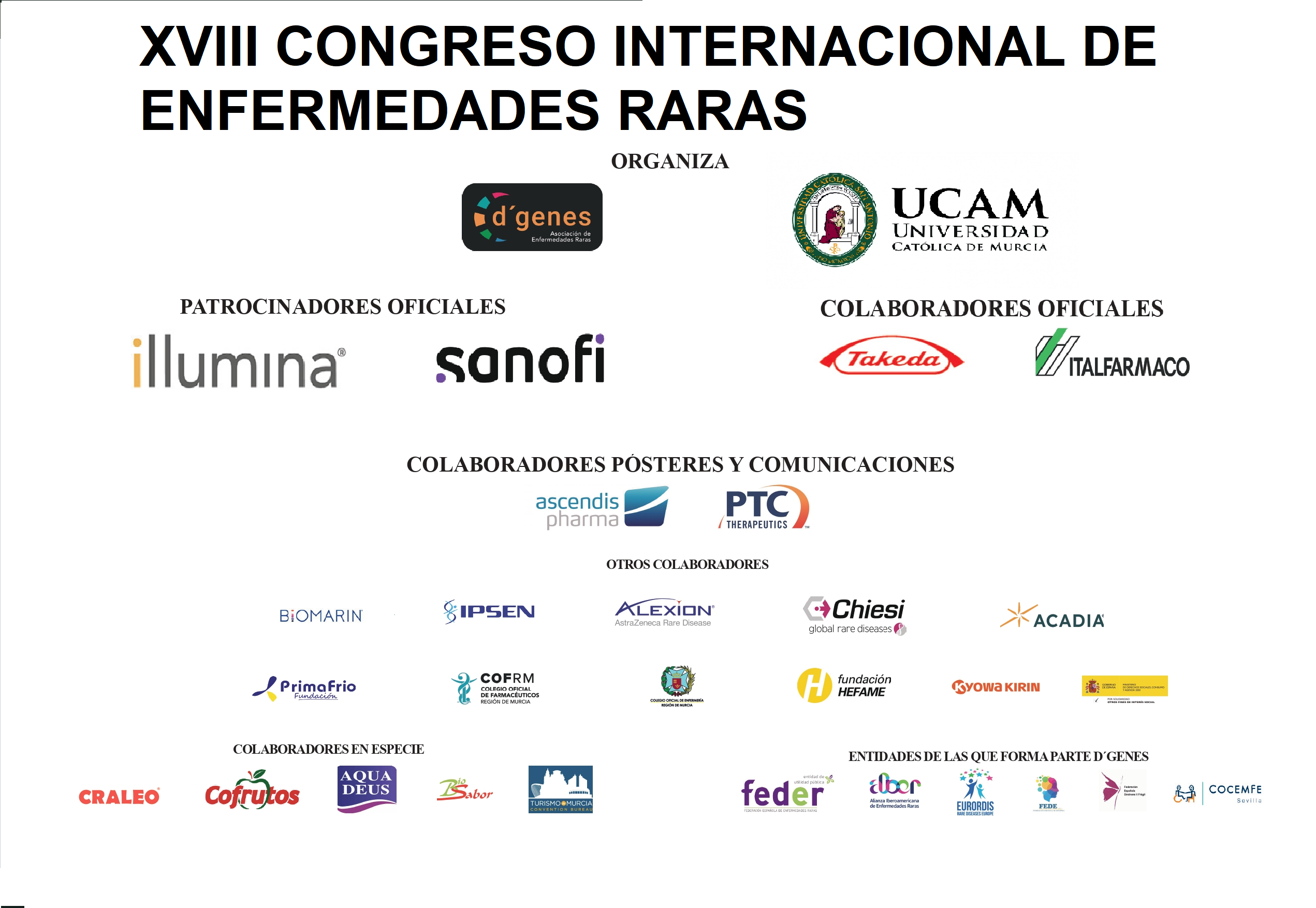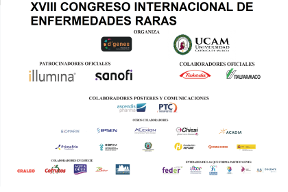 Una veintena de entidades y empresas farmacéuticas patrocinan o colaboran con el XVIII Congreso Internacional de Enfermedades Raras que, organizado por la Asociación de Enfermedades Raras D´Genes con la colaboración de la Universidad Católica San Antonio de Murcia (UCAM), se celebra los días 20 y 21 de noviembre.