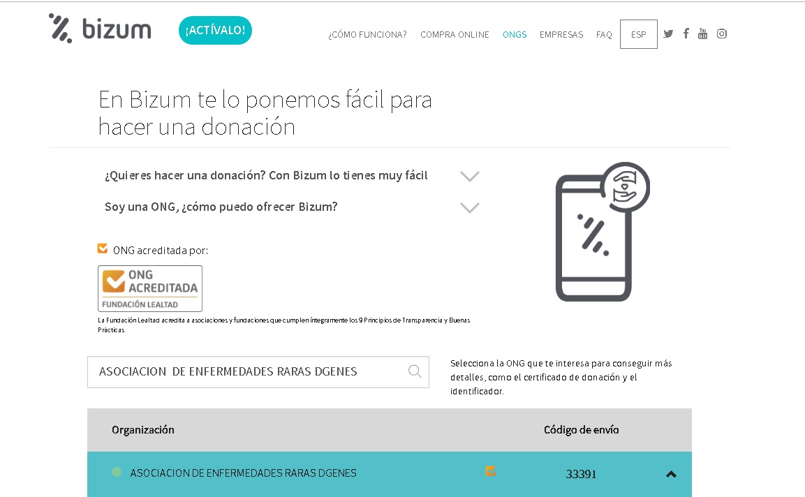 La Asociación de Enfermedades Raras D´Genes ya puede recibir donaciones a través de Bizum, la nueva plataforma de pagos a través de móvil que permite enviar y recibir los fondos en tiempo real. Bizum es una plataforma de pagos cuenta a cuenta a través del móvil y también facilita a las organizaciones no lucrativas un canal para recibir donaciones a través de Bizum ONG.